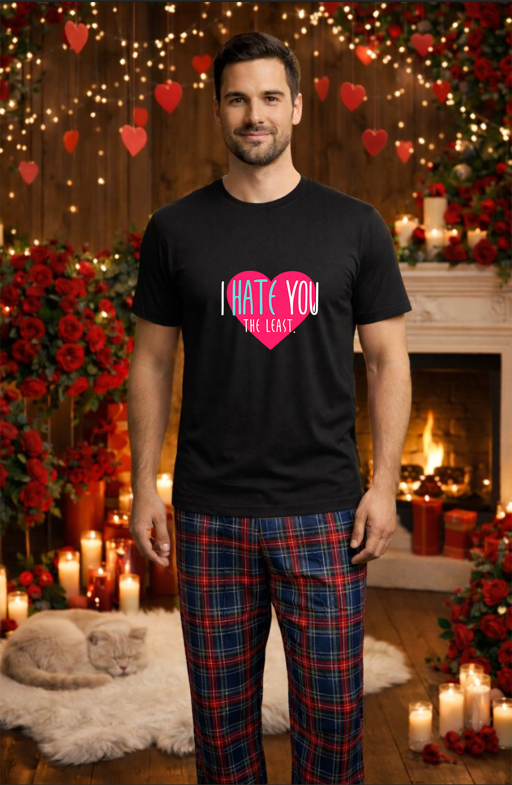 Pijamale barbati din colectia Valentine’s Day si Dragobete, realizate pentru confort zilnic si momente speciale. Setul este format din tricou unisex 100% bumbac si pantaloni de pijama din amestec 50% bumbac si 50% poliester, pentru respirabilitate, durabilitate si intretinere usoara. Printurile tematice romantice fac aceste pijamale pentru barbati ideale pentru somn, relaxare si cadouri de Valentine’s Day, Dragobete sau aniversari.