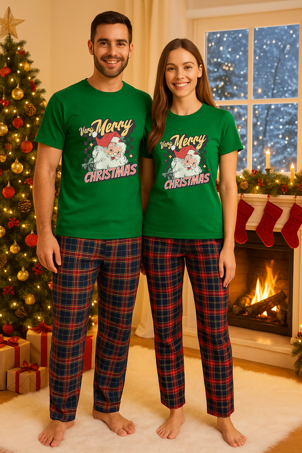 Setul de Craciun pentru cuplu imbina confortul si stilul intr-o tinuta perfecta pentru sarbatorile de iarna, de Craciun. Format dintr-un tricou din bumbac 100% si pantaloni de pijama din amestec 50% bumbac si 50% poliester, ofera o senzatie placuta pe piele si libertate de miscare. Tricoul este moale si respirabil, ideal pentru purtare zilnica sau relaxare acasa. Pantalonii au talie elastica si croiala lejera, fiind practici si confortabili in serile reci de iarna.